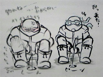 んでまあ二人並んで氷に穴開けて釣りするんですが何故かボケ(青)の方ばっかりよくかかるかかる(笑)。ツッコミ(赤)の方にもたまーにかかるんですけど、引き上げようとしたら逃げられたりの繰り返し。相方が3匹釣り上げるもこっちは釣果はゼロ。しまいにゃ不貞腐れちゃいます。
